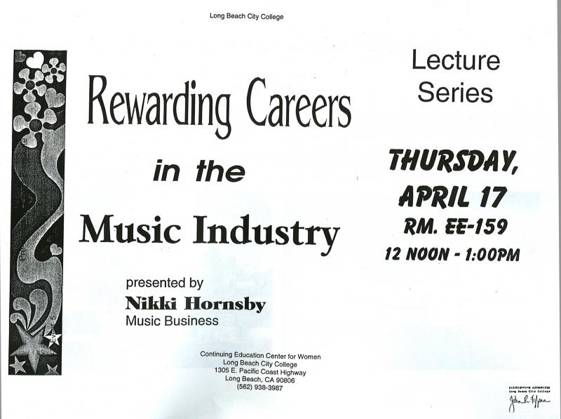Below: Nikki Hornsby conducts lectures regarding the music recording industry based on personal experience & knowledge. Sample of a flyer.