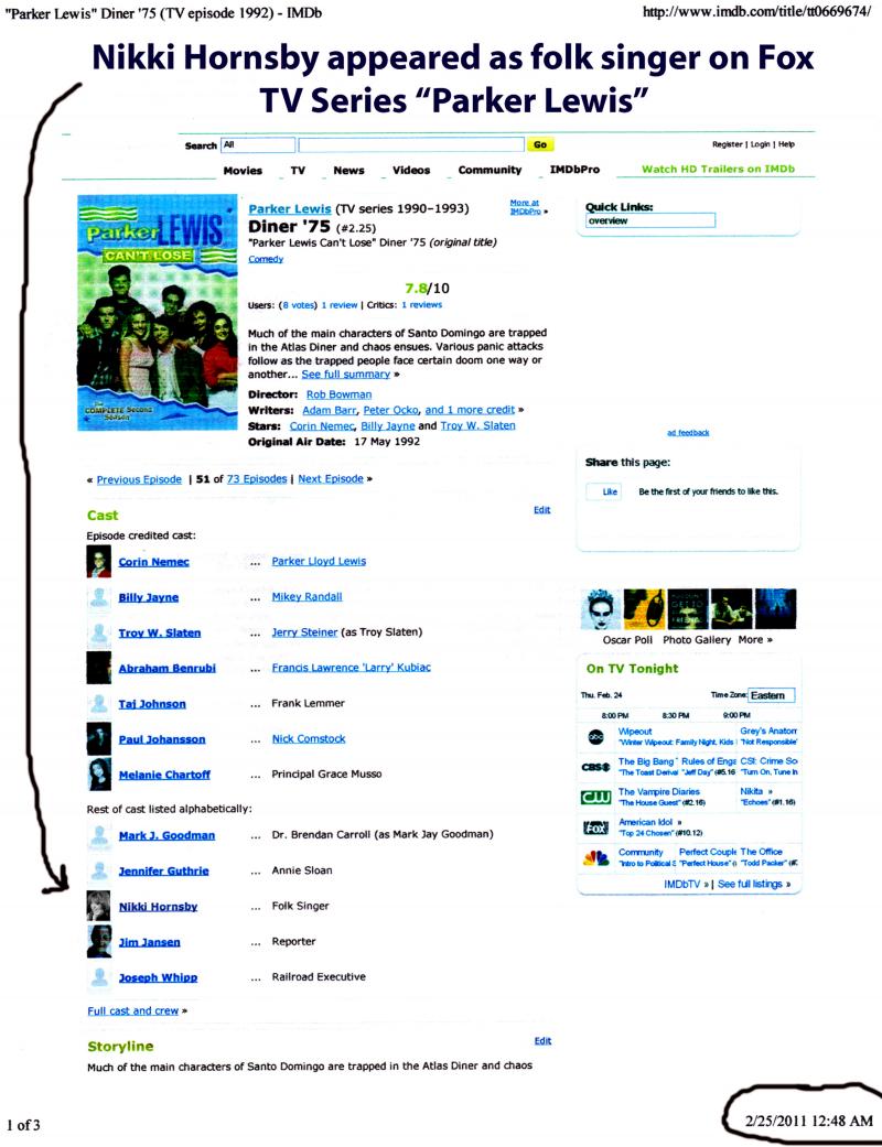 Screen Actors Guild (SAG) even offered Nikki Hornsby a membership in 2004. She had worked on the Fox series final show under "Taft Hartley" but after her last Movie part she was asked to join. This SAG offer was an honor for Nikki because she knows she's a singer-songwriter, musician, and business woman who respects the arts as a gift and responsibility to the gifts she carries.